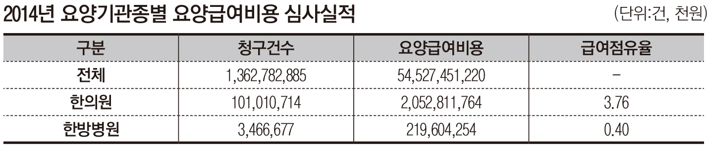 국민건강보험공단(이사장 성상철)과 건강보험심사평가원(원장 손명세)이 최근 발간한 ‘2014년 건강보험통계연보’에 따르면, 2014년도 건강보험요양급여비용 총 지급액 54조 5275억원 중 한의의료기관이 차지하는 금액은 2조 2724억원으로 전체 의료기관 요양급여 지급비용의 4.2% 점유하는데 그쳤다.
