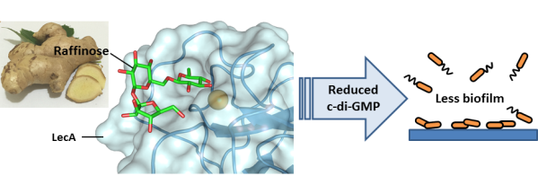 또한 연구팀은 핵자기공명분광학과 분자결합모델링 연구결과 라피노스가 생물막 형성을 저해하는 원리를 밝혀냈다. 라피노스가 녹농균이 가지고 있는 갈락토스 수용체인 LecA와 경쟁 결합을 하며 이를 통해 세포내 2차 신호전달물질인 c-야-GMP의 농도를 현저하게 낮춤으로 생물막 형성이 저해된다는 것을 규명한 것.