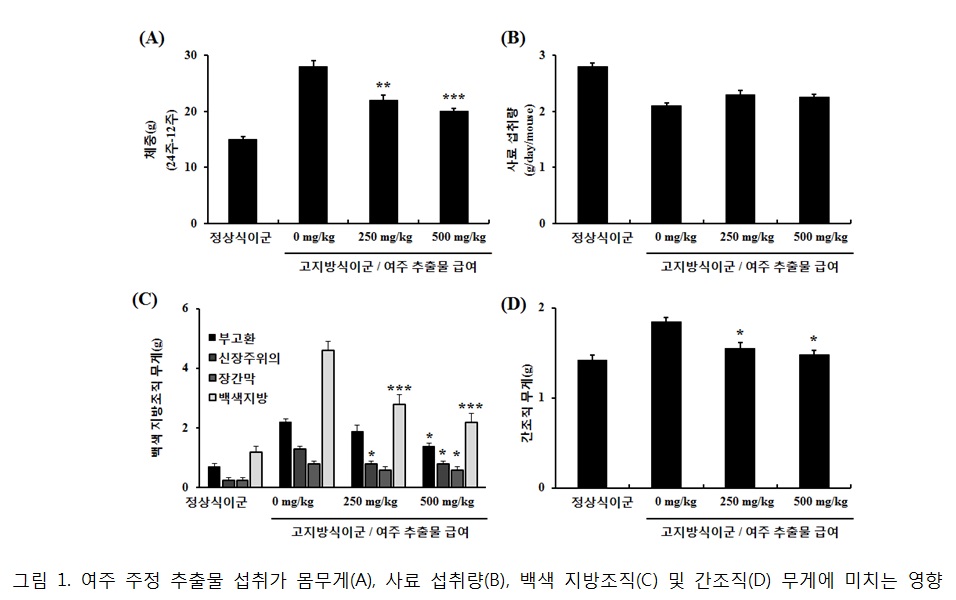 이렇게 만들어진 여주 추출물을 고지방식이를 급이 한 흰쥐에게 12주 동안 먹인 결과 추출물을 먹인 쥐가 먹이지 않은 쥐에 비해 체중은 18.5%, 남은 칼로리를 저장하는 백색 지방조직의 무게는 50%, 간 조직의 무게는 24% 줄어든 것으로 나타났다.