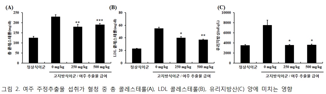 혈중 총 콜레스테롤도 추출물을 먹인 쥐가 먹지 않은 쥐에 비해 18% 줄었으며 나쁜 콜레스테롤이라 불리는 LDL 콜레스테롤 또한 29% 줄었다.