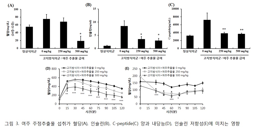 이뿐만 아니라 고지방식이를 하면서 여주 추출물을 먹은 흰쥐가 고지방식이만 한 흰쥐보다 공복 혈당은 25% 감소하고 내당능은 당부하 후 1시간 기준으로 27% 개선됐으며 인슐린 저항성은 인슐린 투여 후 1시간 기준으로 54% 개선돼 혈당 조절 효과를 확인했다.